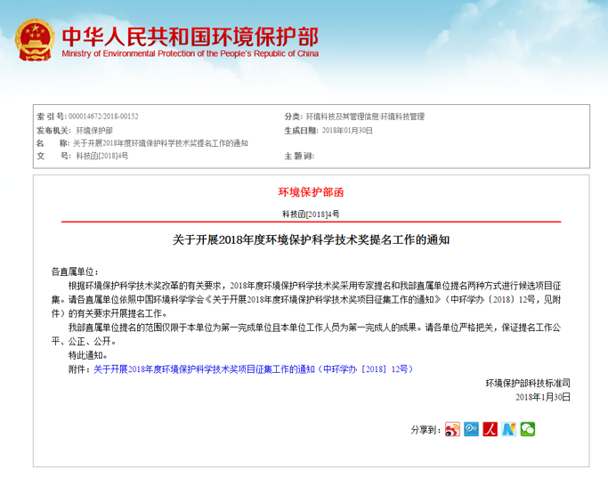 關(guān)于開展2018年度環(huán)境保護科學(xué)技術(shù)獎項目征集工作的通知