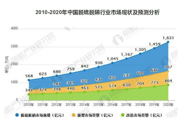 當(dāng)前,煙氣除塵、脫硫、脫硝是大氣污染治理的三大業(yè)務(wù)板塊,據(jù)前瞻產(chǎn)業(yè)研究院發(fā)布的《大氣污染治理行業(yè)市場前瞻與投資戰(zhàn)略規(guī)劃分析報告》統(tǒng)計數(shù)據(jù)顯示,2015年,我國脫硫脫硝行業(yè)需求規(guī)模超過900億元,其中新增市場容量超過400億元,改造市場容量超過500億元,且隨著國家大氣污染法規(guī)標(biāo)準(zhǔn)越來越嚴(yán)格,未來5-10年將是中國大氣污染治理的重點(diǎn)時期,市場容量將繼續(xù)保持在10%左右的增幅。