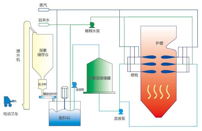 SNCR脫硝系統(tǒng)是將NH3、尿素等還原劑噴入鍋爐爐內(nèi)與NOx進(jìn)行選擇性反應(yīng),不用催化劑,因此必須在高溫區(qū)加入還原劑。還原劑噴入爐膛溫度為850~1100℃的區(qū)域,迅速熱分解成NH3,與煙氣中的NOx反應(yīng)生成N2和水,該技術(shù)以爐膛為反應(yīng)器。我公司設(shè)計(jì)的SNCR煙氣脫硝技術(shù)的脫硝效率一般為60%,采用尿素或者氨水作為還原劑。其特點(diǎn)為: