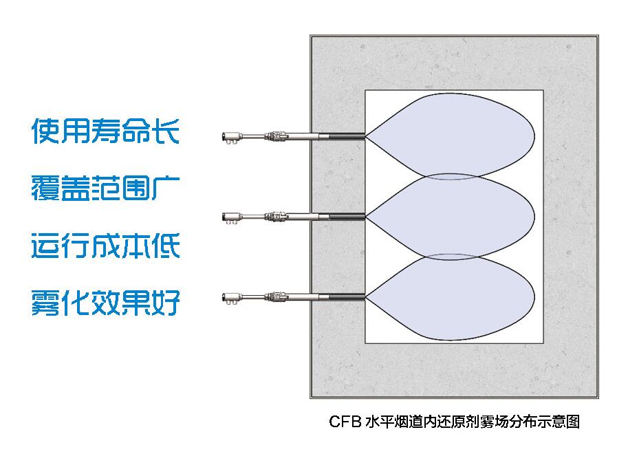 針對(duì)大爐膛的鍋爐,HBCY-FT高效節(jié)能鍋爐專用脫硝噴槍現(xiàn)已投入到眾多廠家使用,并解決了用戶在使用SCR脫硝時(shí)遇到的難題,得到用戶的普遍認(rèn)可。使用這種長噴槍和短噴槍組合的方案,還原劑霧場(chǎng)覆蓋面積遠(yuǎn)大于傳統(tǒng)普通噴槍,保證脫硝效率,降低用戶運(yùn)行成本。